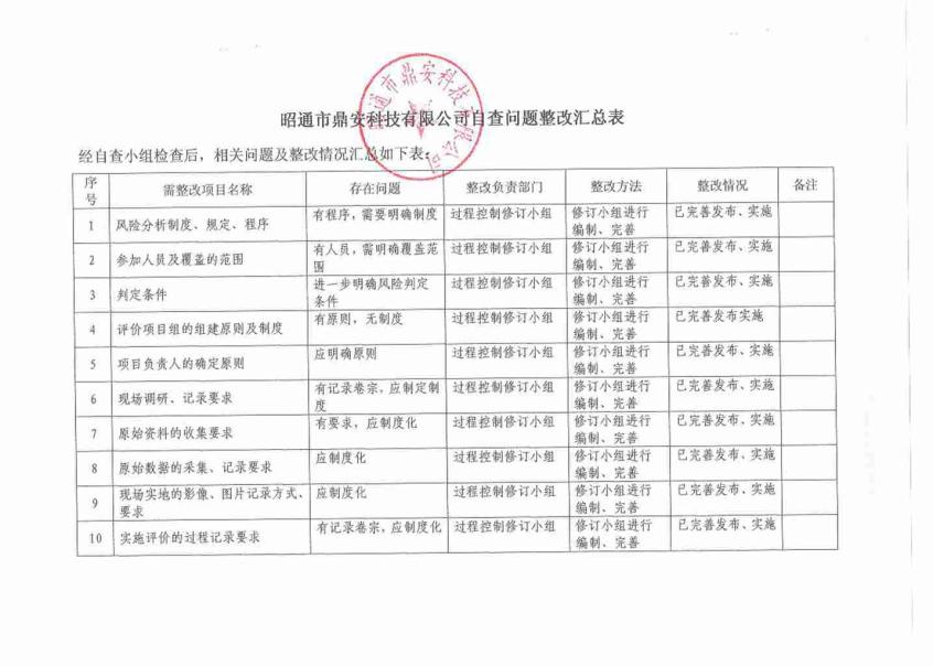 昭通市鼎安科技有限公司自查問題整改情況匯總表