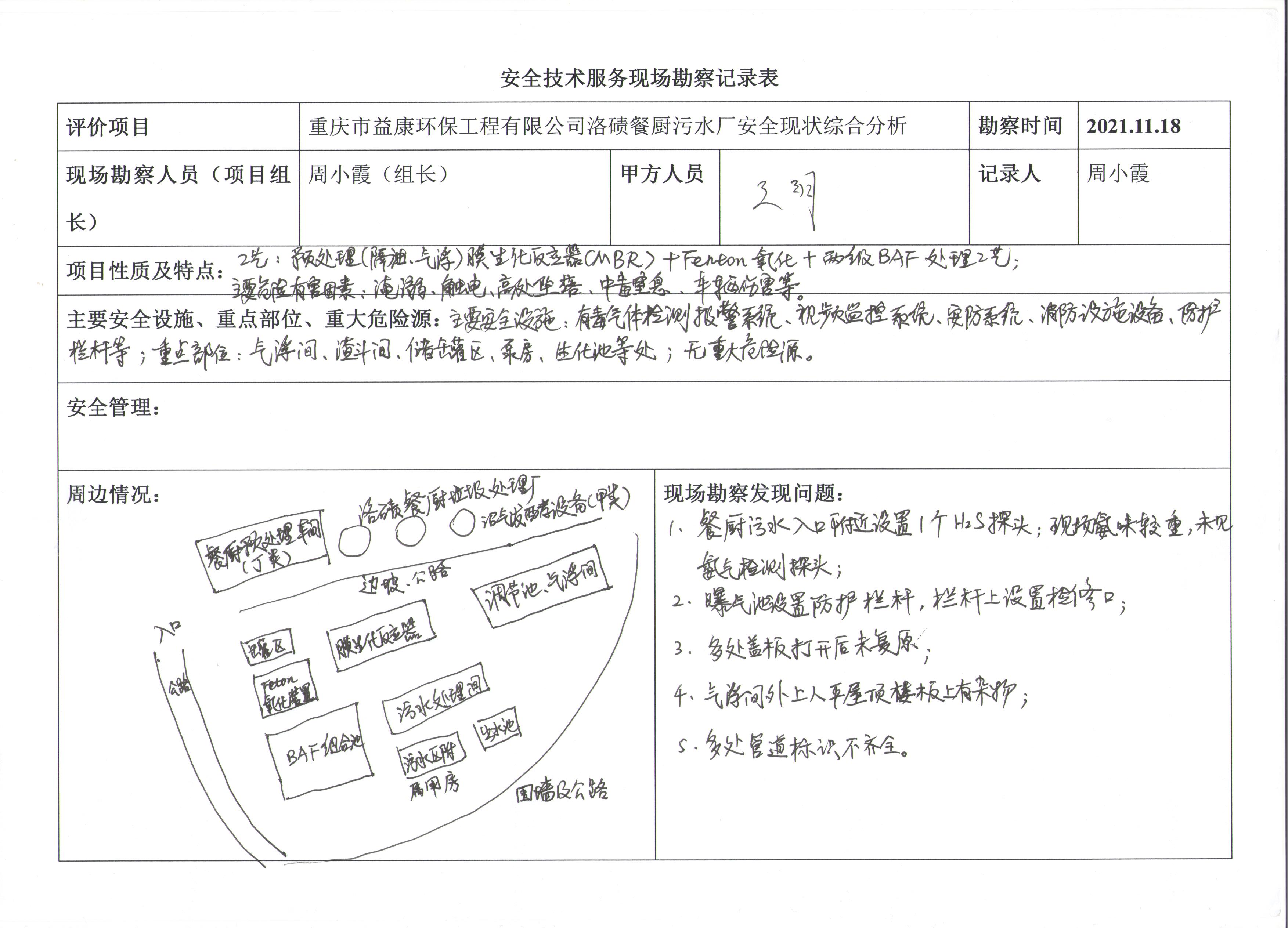 現(xiàn)場勘查情況 | 重慶市益康環(huán)保工程有限公司洛磧餐廚污水廠安全狀情況 | |||||||